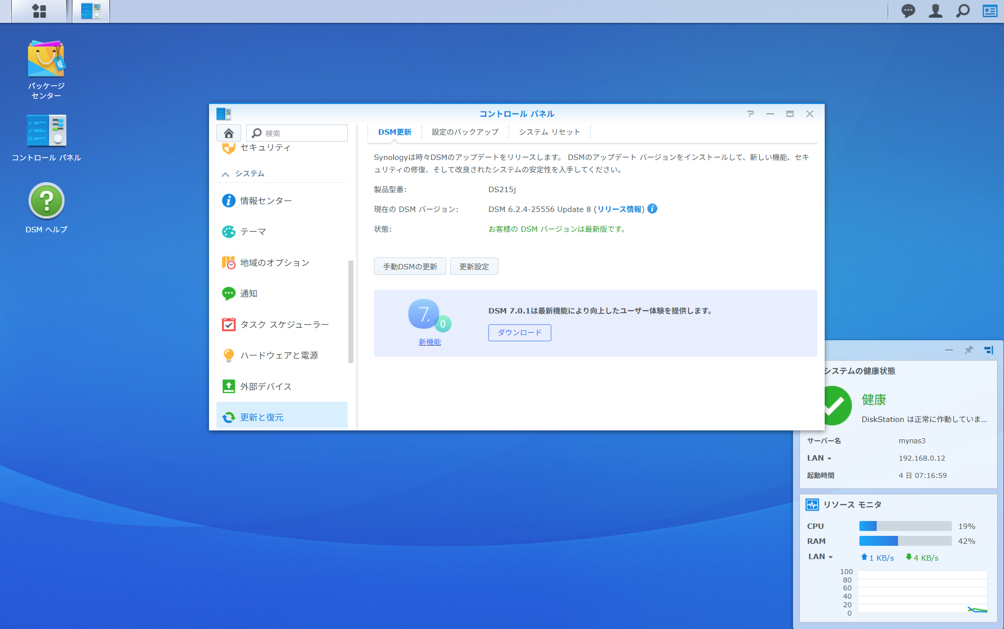 コントロールパネル > 更新と復元 > DSM更新 > ダウンロード